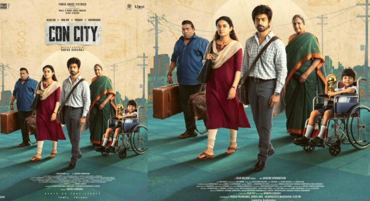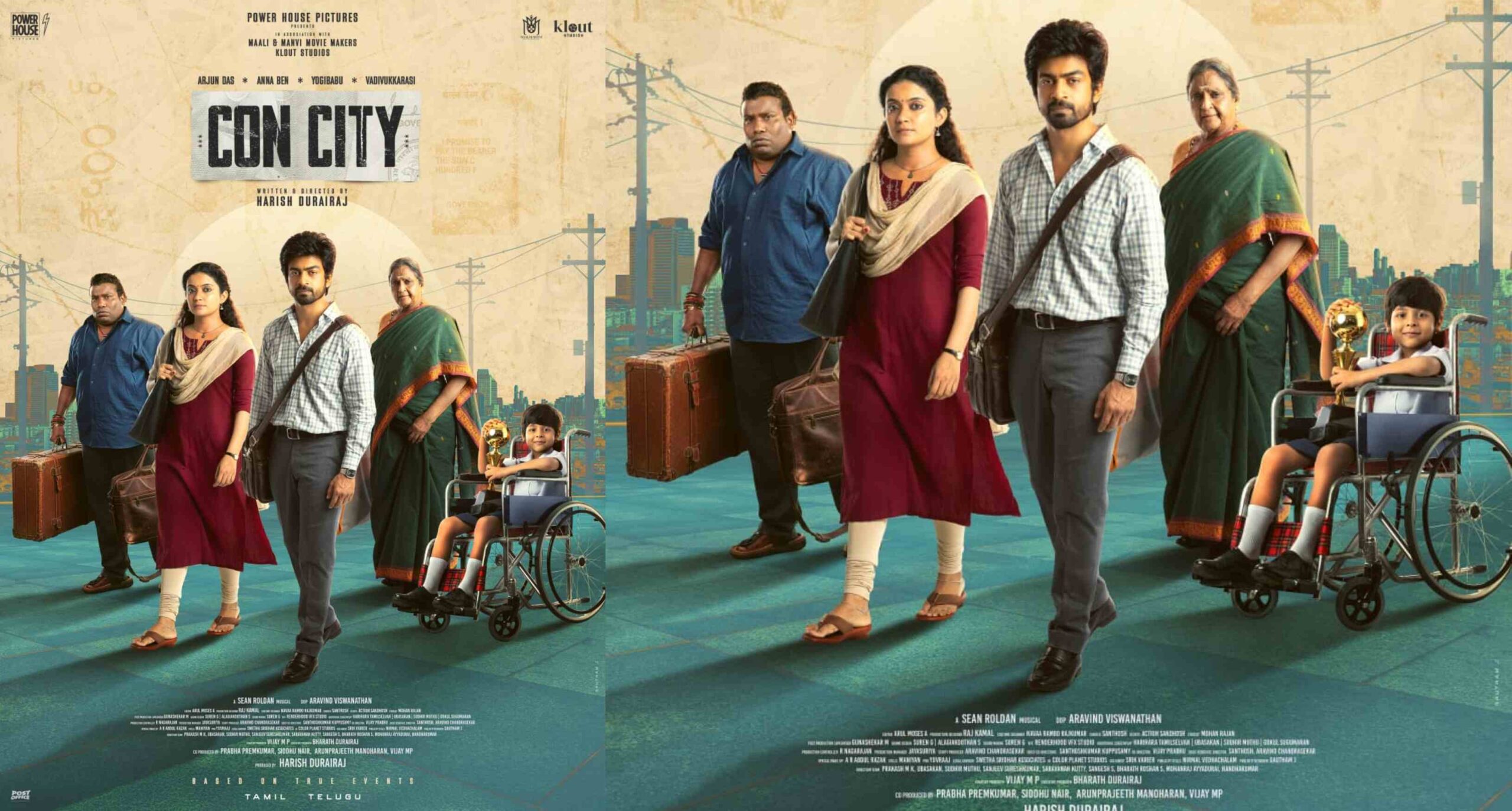 ‘கான் சிட்டி’ ஃபர்ஸ்ட் லுக் போஸ்டர் பார்த்தவுடன் புன்னகை வரவைக்கும் அதே நேரம்,  ஒரு மிடில் கிளாஸ் குடும்பத்தின் எமோஷனல் பக்கத்தையும் வெளிப்படுத்துவதாக அமைந்துள்ளது.  நகரப் பின்னணியில், ஆபிஸ் பேக்குடன் அர்ஜூன் தாஸ் அவரைச் சுற்றி ஹேண்ட் பேக்குடன் அன்னா பென்,  பயணப்பெட்டி பையுடன் யோகிபாபு மற்றும் வடிவுக்கரசி ஆகியோருடன் வீல் சேரில் ஒரு வெற்றிக் கோப்பையுடன் குழந்தை அகிலன் என,  முற்றிலும் வித்தியாசனான  இந்த போஸ்டர்,  படத்தின் கதைக்களம் என்னவாக இருக்கும் எனும் ஆவலைத் தூண்டுகிறது. கான் சிட்டி எனும் தலைப்பு இது முழுமையான கமர்ஷியல் ஃபேமிலி எண்டர்டெயினர் படம் என்பதை உணர்த்துகிறது.