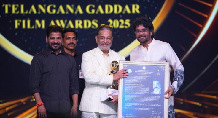 ‘தெலுங்கானா கட்டர் திரைப்பட விருதுகள் 2025’ விழா ஹைதராபாத்தில் 19-03-2026 அன்று நடைபெற்றது. இந்த நிகழ்வில் தெலுங்கானா அரசின் உயரிய விருதான ‘பைடி ஜெய்ராஜ்’ விருது கமல்ஹாசன் அவர்களுக்கு வழங்கி கெளரவிக்கப்பட்டது.