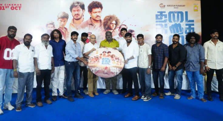 காந்திமதி பிக்சர்ஸ் என்ற நிறுவனம் சார்பில் அறிவழகன் முருகேசன் தயாரித்து இயக்க, அங்காடித்தெரு மகேஷ், திருக்குறள் குணாபாபு நடிப்பில், 1990களுக்கு முன்பு நடந்த உண்மைச் சம்பவத்தை கொண்டு உருவாக்கப்பட்டுள்ள திரைப்படம் ” தடை அதை உடை “. இத்திரைப்படம் தமிழ்நாடு முழுவதும் அக்டோபர் 31 ஆம் தேதி திரையரங்குகளில் வெளியாக உள்ள நிலையில், இப்படத்தின் இசை மற்றும் டிரெய்லர் வெளியீட்டு விழா, திரை பிரபலங்களுடன் படக்குழுவினர் கலந்துகொள்ள பத்திரிக்கை ஊடக நண்பர்கள் முன்னிலையில் கோலாகலமாக நடைபெற்றது.
